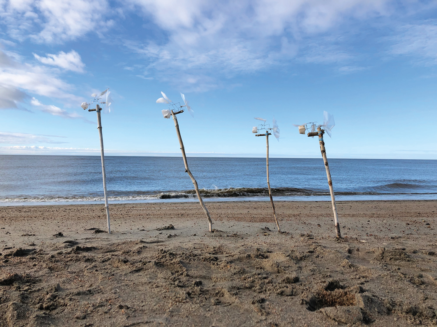 Elico marche sur la pointe de Moisie. Elle découvre un paysage qu’elle ne soupçonnait pas et le sillonne avec intensité et vigilance. Elle transforme sa chambre en atelier et y passe des heures à travailler : le jour, la nuit. Elle expérimente des mécanismes cinétiques portatifs qui tiennent dans la main. Fruits d’un assemblage de plumes d’oiseaux, de bois de grève et de petites formes de papier obtenues par pliage, ces sculptures s’animent sous l’action d’un souffle : celui de l’artiste ou du vent. Réceptive aux vents de la Côte-Nord, Elico place les sculptures sur le bord de la mer les jours de grand vent et enregistre leurs mouvements erratiques et leurs sonorités. Lors d’une de nos conversations, elle évoque la notion de « réalisme magique », élément important dans son travail qu’elle dit percevoir sur la base. En ce début de juin, le temps est maussade ; plusieurs jours de pluie consécutifs. Elico nous initie au charme du teru teru bozu (amulette fabriquée à la main pour, entre autres, conjurer le mauvais temps). Nous apprenons quelques mots de japonais : bozu [bonze], teru [brillant, ensoleillé]. Toutefois, la pluie résiste à l’effet de l’amulette.
