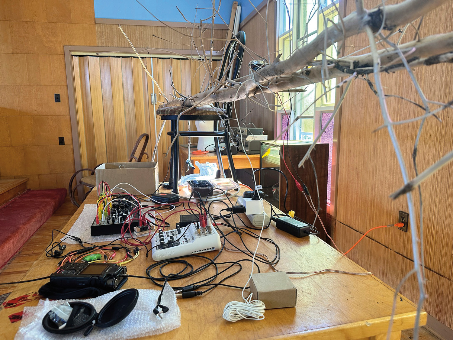 John privilégie également l’observation. Son attention se tourne vers les marées et leur influence sur le niveau changeant de la mer et de la rivière. Vivant en Estonie, pays où les marées sont presque imperceptibles, John est troublé et fasciné d’être témoin de ces modulations infléchies par ce phénomène qui engendre parfois des scènes impressionnantes. Son travail module son quotidien. L’artiste réagit aux heures des marées, à la vélocité du vent, aux jours de pluie et de soleil ou au temps nuageux pour ses captations sonores. Durant son séjour, il effectue de nombreux enregistrements de terrain (field recordings) et élabore, entre autres, une harpe éolienne portative et une harpe aquatique – dispositif conçu pour capter le courant